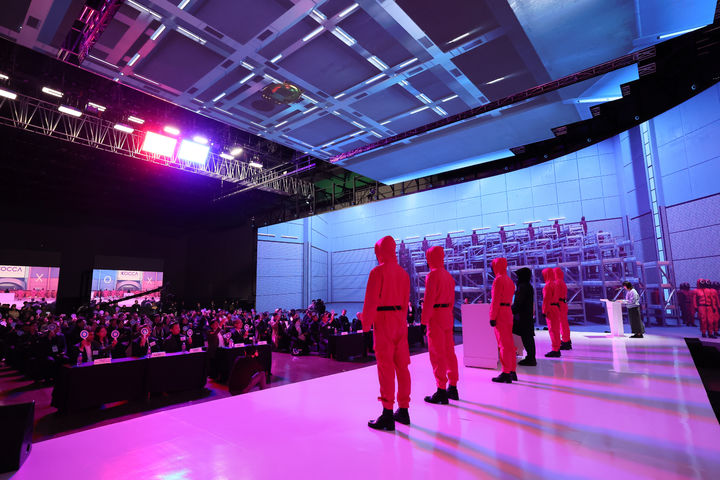 LED화면은 스튜디오큐브에서 촬영한 넷플릭스 드라마 ‘오징어 게임’으로 꾸며졌다. 유 원장 직무대행은 이에 맞춰 직접 드라마 속 캐릭터인 프런트맨으로 깜짝 등장하는 퍼포먼스를 보여줬다.