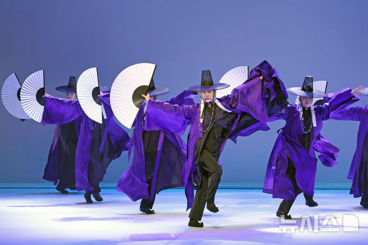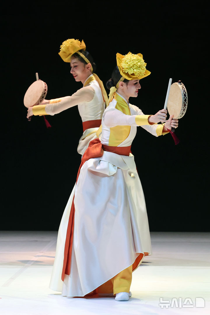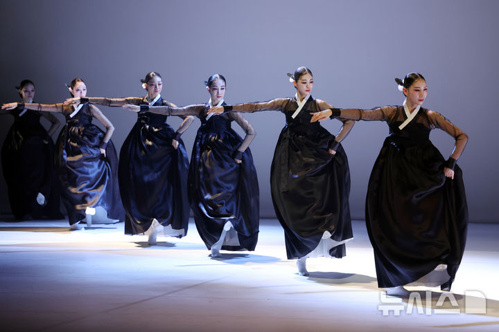 [서울=뉴시스] 최희정 기자 = 7명의 여성 무용수들이 고운 자태로 무대 위에서 사뿐사뿐 움직인다. 흰색 저고리에 파란색과 붉은 색이 배색된 치마를 입은 이들은 기생의 ‘교방무’를 추며 한폭의 한국화처럼 펼쳐졌다.