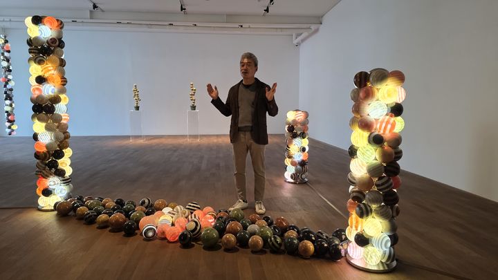 [서울=뉴시스] 박현주 미술전문 기자 = 알알이 매달려 기둥을 이룬 구슬이 색색의 빛을 낸다. 멀리서 보면 알사탕처럼 가볍지만, 가까이 다가가면 묵직하다. 대리석이다. 단단하지만 그 안의 온도는 달라졌다.