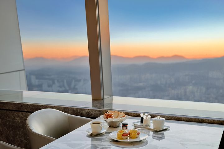 시그니엘 서울 79층에 위치한 ‘더 라운지(The Lounge)’는 오전 6시 30분부터 9시까지 두 가지 조식 세트 메뉴를 제공한다.