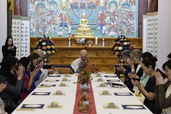 [서울=뉴시스]이수지 기자 = 대한불교조계종 총무원장 진우 스님이 아시아태평양경제협력체(APEC) 정상 배우자들에게 한국 전통불교문화를 알렸다.