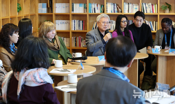 문 전 대통령은 이날 행사 옆 공간 문발살롱에서 작가 정보라·정지아와 해외 초청 작가와 차담회를 가졌다.