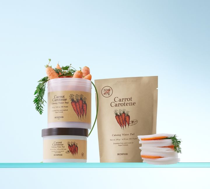 스킨푸드가 소비자 요청에 캐롯 카로틴 카밍 워터 패드(당근패드)의 30매입 소용량 제품을 출시하고 리필형 파우치도 개선했다.