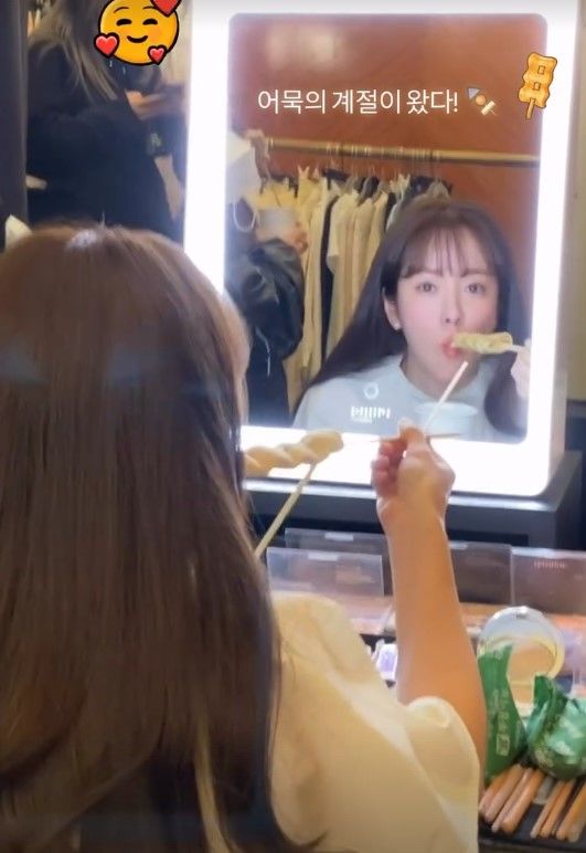 또 다른 사진에는 거울 앞에 앉아 어묵을 먹는 소탈한 일상이 담겼다.