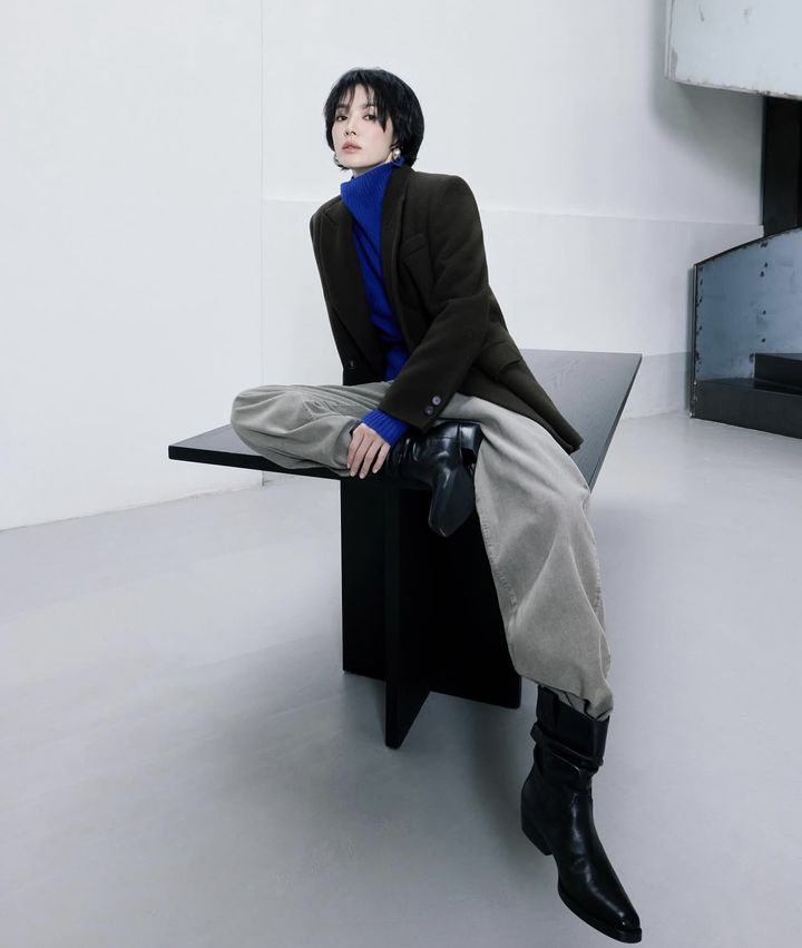 송혜교는 조형물에 앉아 포즈를 취했다.