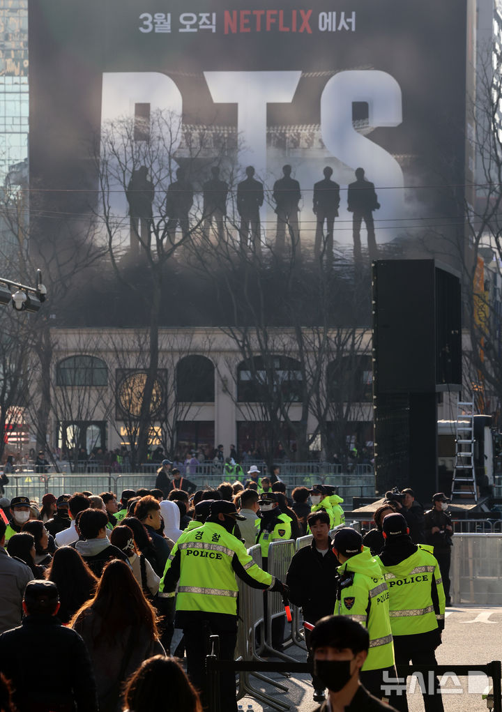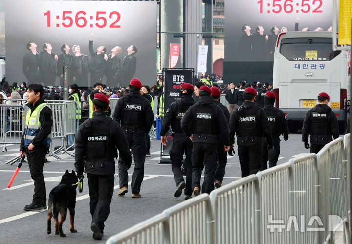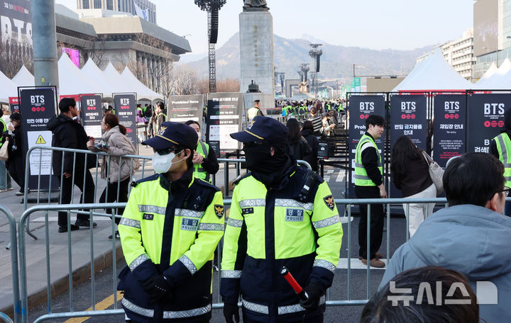 이번 공연을 위해 광화문 일대에는 총 31개 출입 게이트가 설치돼 관람객 유입이 통제된다. 게이트에는 MD가 1~4대씩 배치되고, 현장 안팎에서는 휴대용 스캐너를 활용한 검문검색이 병행됐다. 경찰은 광화문 일대를 여러 권역으로 나눠 인파 밀집도에 따라 출입을 단계적으로 제한하고, 공연 종료 이후에는 외곽부터 순차적으로 인파를 분산시켰다.